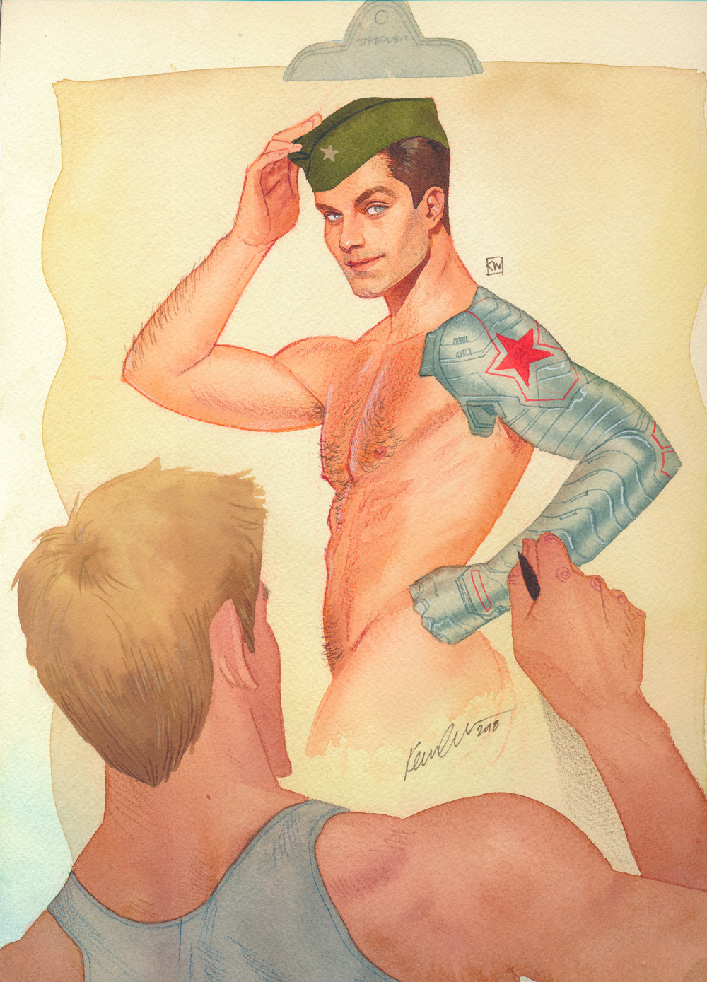 He took the prompt of Steve painting a pinup of Bucky, post Winter Soldier and did AMAZING with it – incorporating some super fun, flirty WW2 pinup vibes and I absolutely ADORE it.