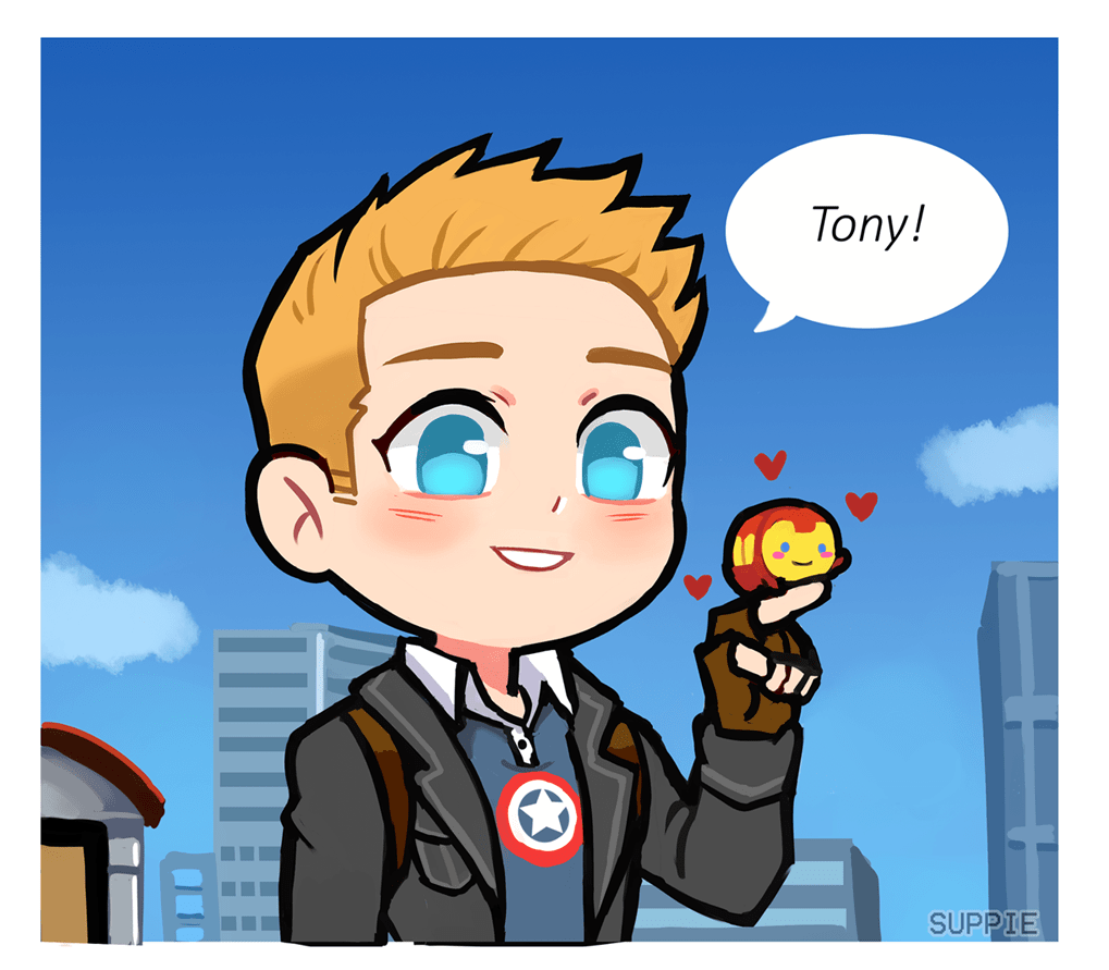 Giftart for the cute and wonderful @nakurumok who made a twitter so we can talk ^//^ she made this adorable avac tony post here , So I drew my version of Steve,iron man tsum greeting them.