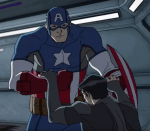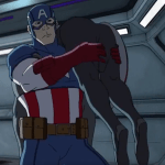 I reached episode 26, the end of season 1 of Avengers Assemble, when I noticed Steve taking a peek at Tony’s tush after picking him up. Steve’s face is reading all kinds of “hm…not bad.”