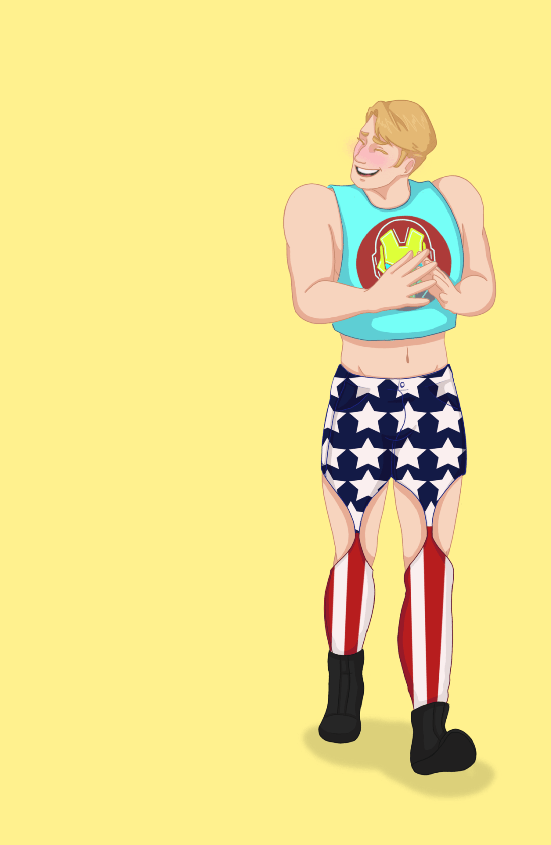Soft and happy Steve Rogers is a GREAT Steve Rogers. He loves wearing anything Tony gets him even when most of them are just jokes he thinks would be funny…like these pants that looks surprisingly good on Steve. Though the shirt was something Steve bought himself thank you very much~