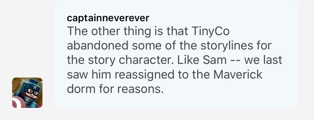 I get why they made the changes but I dunno, I miss a lot from version 1 and darn it, I want more for the storyline characters other than what we got. We’ve got more development for event characters we’ll never use or see again except for on the mission board.