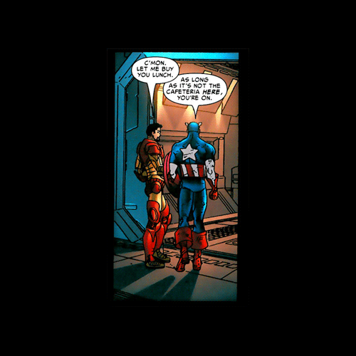 capneverever Uncategorized July 10, 2018December 15, 2018 1 Minute : Tony: C’mon let me buy you lunch. Steve: As long as it’s not the cafeteria here. You’re on. From Marvel Team Up v3 #6 Share this: Click to share on X (Opens in new window) X Click to share on Facebook (Opens in new window) Facebook Like Loading... Related Published by capneverever View all posts by capneverever Published July 10, 2018December 15, 2018