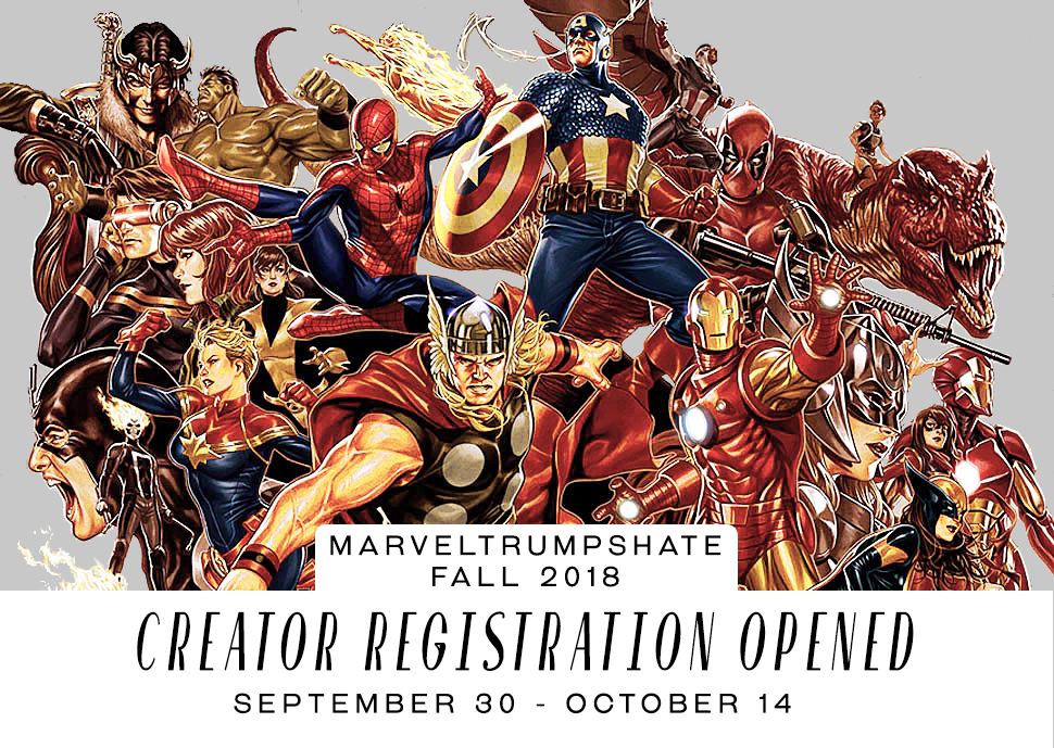 Creator registration for Marvel Trumps Hate is officially open! We are accepting sign-ups from now until 11:59 PM ET on October 14 (what time is that for me?), with bidding taking place a week after that, from October 21 to October 27. All auction times will be in Eastern Time (ET). Please read our participation page for instructions and information you need to know before signing up.