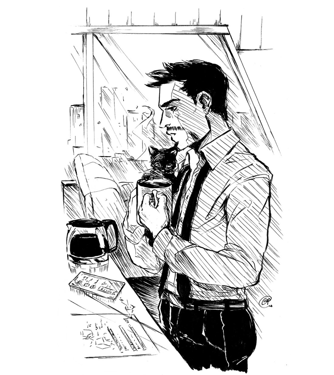 inktober 11- morning coffee (Goldie is attracted to coffee just like his dad)