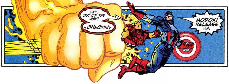 Tony is always willing to sacrifice himself for Steve (even when he’s already injured.) And Steve is gonna mess MODOK up for hurting his bae!