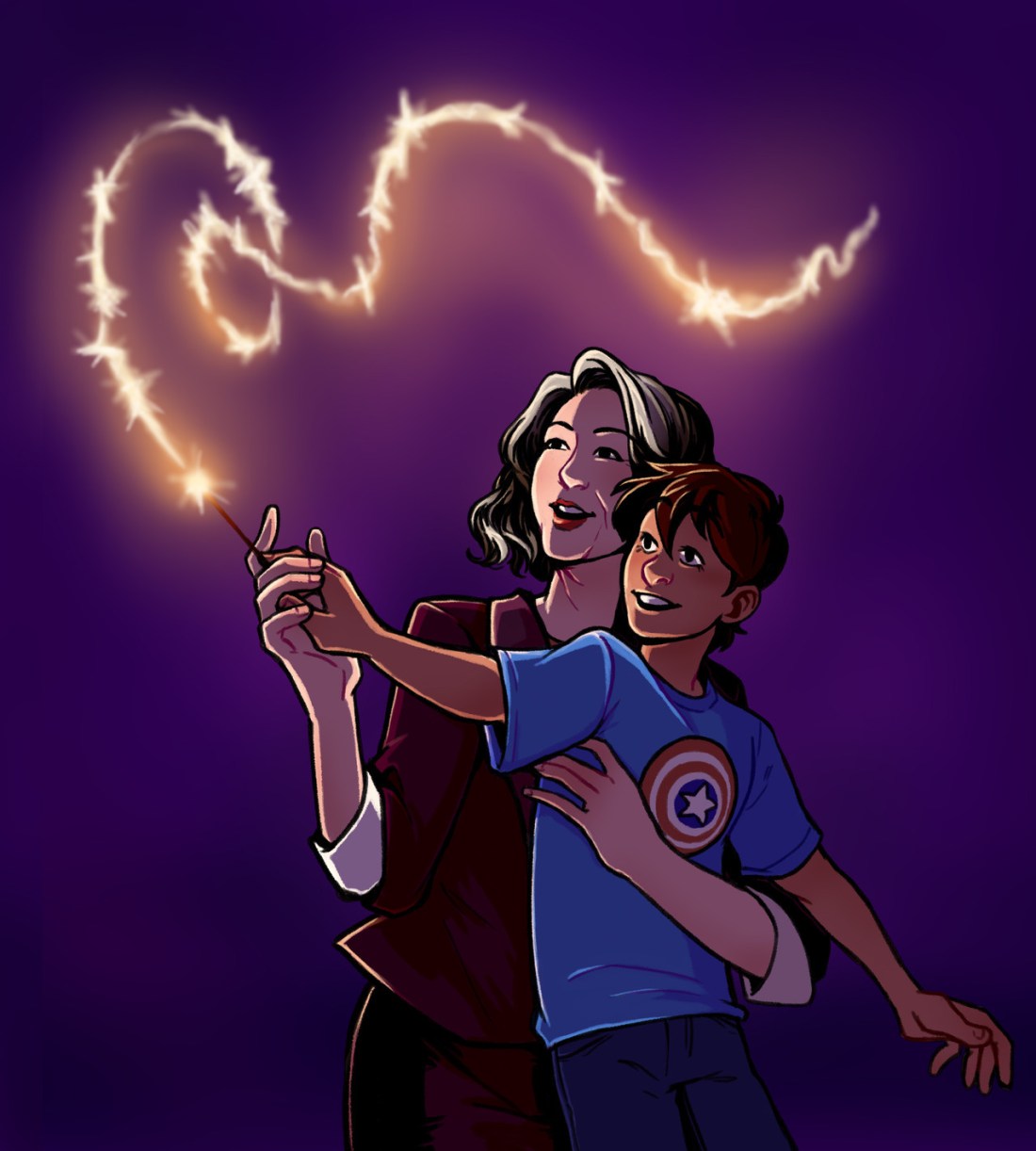 [image description: An older Peggy Carter holds a young Tony Stark from behind as they wave a sparkler through the night air]