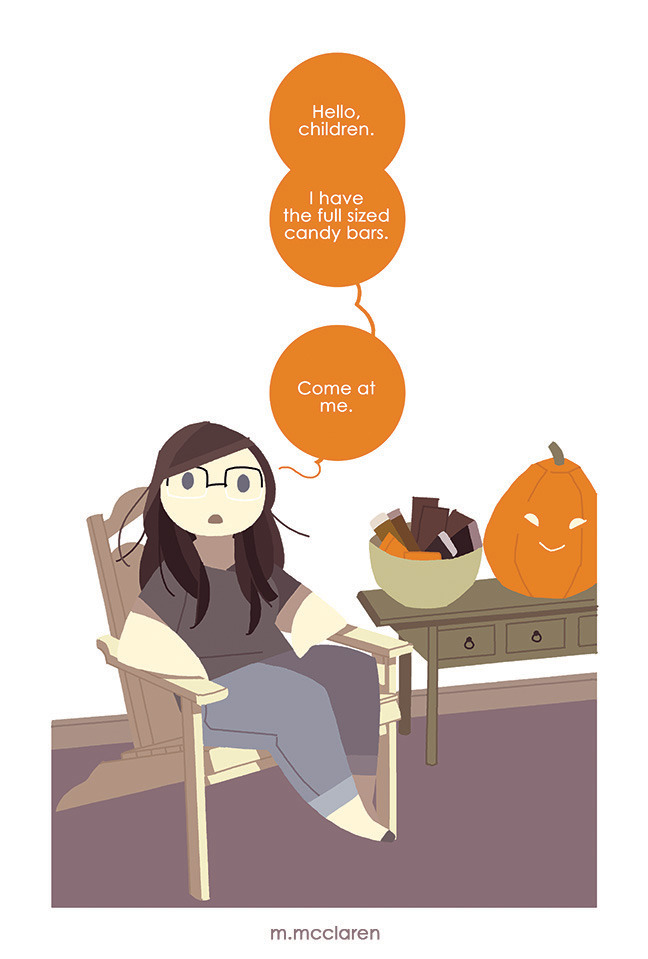 [Description: A cartoon of myself sitting in a porch chair. Beside me is a bowl of candy and a jack-o-lantern on a small table. In speech bubbles reads: ‘Hello, children. I have the full sized candy bars. Come at me.’]