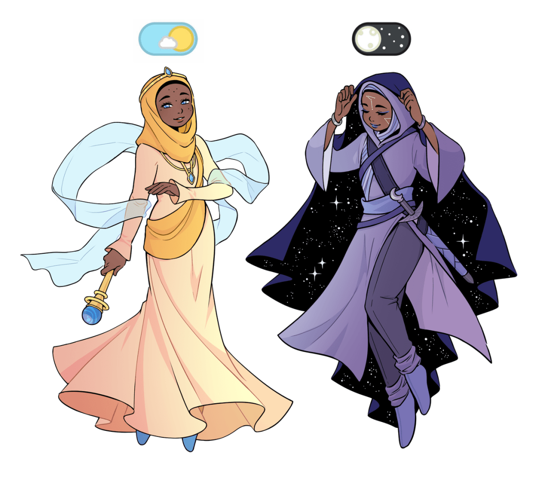 day and night. i was thinking about a member of the royal court who moonlights as a city guard… the constellations on her face are made up of her freckles!
