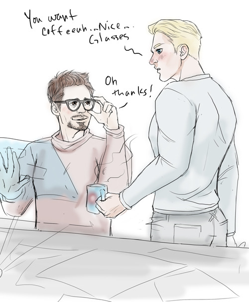 Another too-cute Ko-Fi sketch for ishipallthings featuring Tony with glasses and a blushing Steve ❤ ❤ ❤ I added sweaters because I’m wearing a sweater I recommend it we’re all cozy as heck.