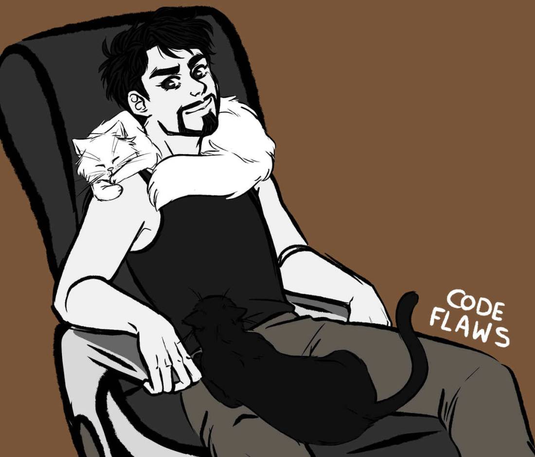 rachel on kofi asked “Could you draw Tony in his lab/workshop clothes with a cat? I feel like he would have either a black cat or a fluffy white one”