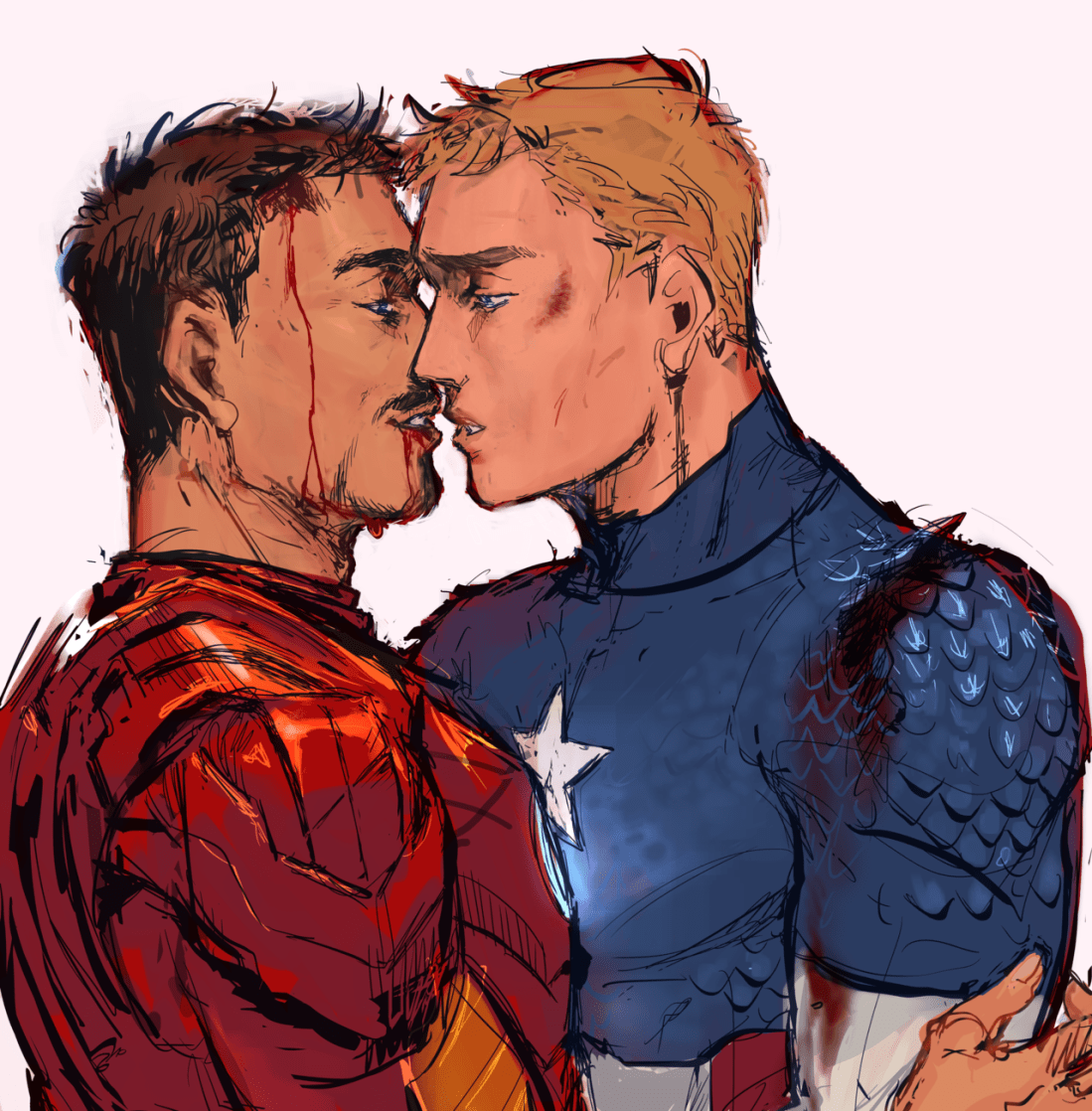 Steve can taste Tony’s blood on his lips, metallic, and sharp; it’s wrong and biting, almost acrid. He cries because that’s all he can taste on those still lips.