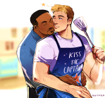 PLUS THEIR APRONS: steve “kiss the captain”, bucky has a disney ratatouille one, and sam references his original falcon design!