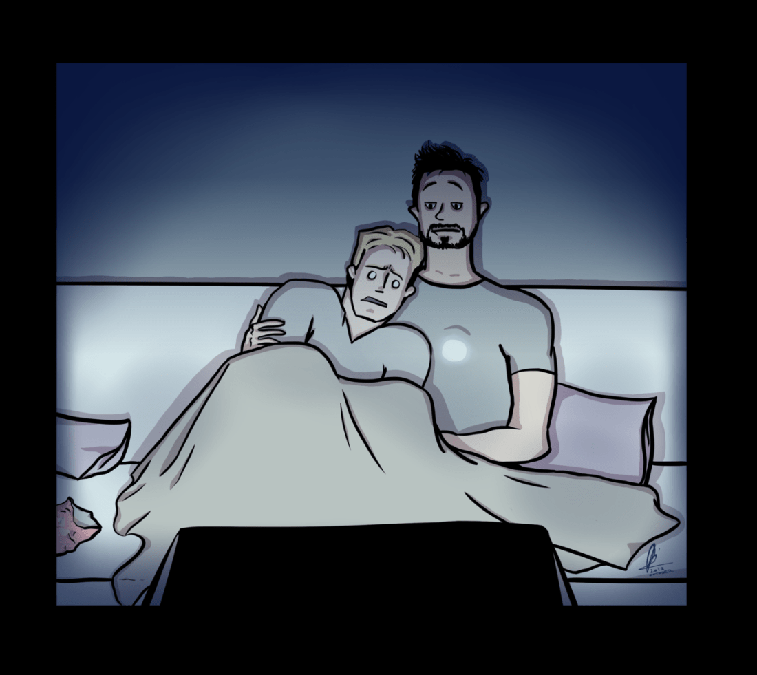 hey so this is my gift for @coveredsnow for the @stevetony-halloween-exchange! the prompt was “cuddling while watching a scary movie” – i’m pretty new to digital art but i hope you like it! 🙂