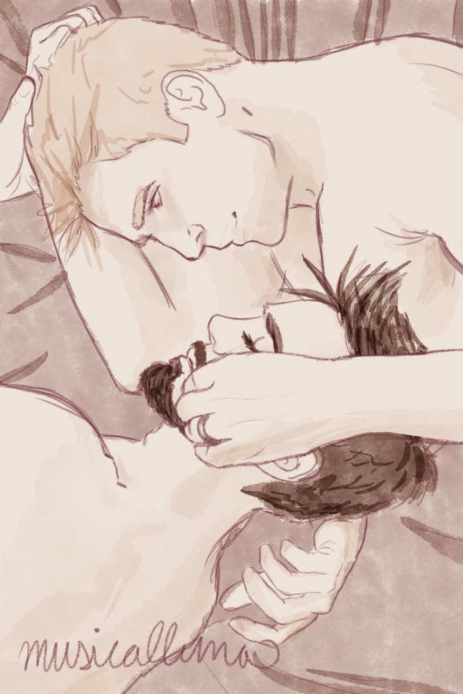 [Image: Steve Rogers curled around Tony Stark in a bed with his hand on Tony’s face. Tony appears to be sleeping. Steve is wearing a wedding ring, and they’re both shirtless.]
